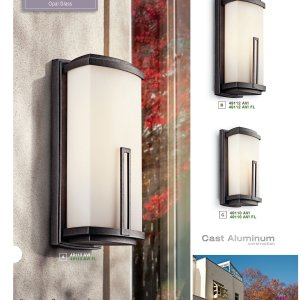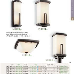 Коллекция уличных светильников Leeds премиум-качества компании Kichler (США) выполнена в современном декоративном стиле. Светильники изготовлены из литого алюминия c покраской Anvil Iron (кованное железо, суффикс AVI), матовое опаловое стекло. Коллекция включает уличные настенные бра нескольких размеров, потолочный светильник, светильник на цепи и садово-парковый вариант фонаря. Светильники имеет защиту IP54 и рассчитаны на круглогодичное использование.